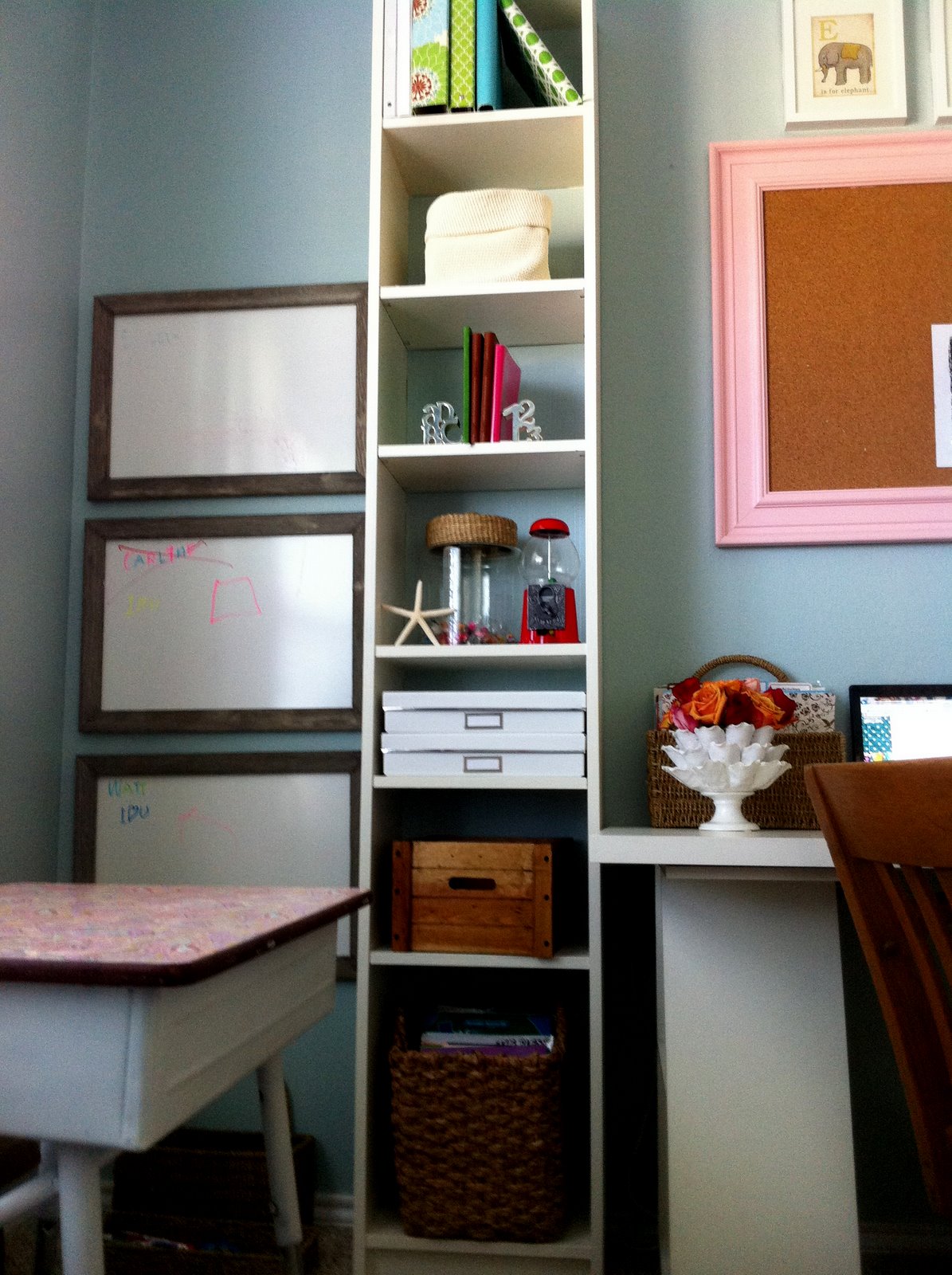 This little spot is to the left of the desks. I finally (after 10 years) framed my diploma. It only took me 7 1/2 years to get it. I was on the 8 year BA plan, but graduated early. HA! I thought the cute little old framing dude at Hobby Lobby was going to stroke out when I said I wanted to mat it in hot pink. I thought it was fun, and why the heck not? The pillows are from TJ's way back. They can be thrown on the floor to read or sit or be jumped on too. Seriously, that is what will happen if you know my kids.
